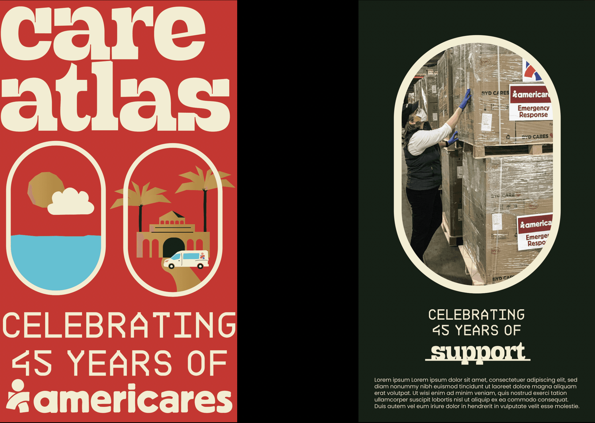 Copy and concepting had to be informative, but catchy enough to pair with a retro, easy-to-love visual identity that tied the Americares brand to the venue. Thus, “Care Atlas” came to be.